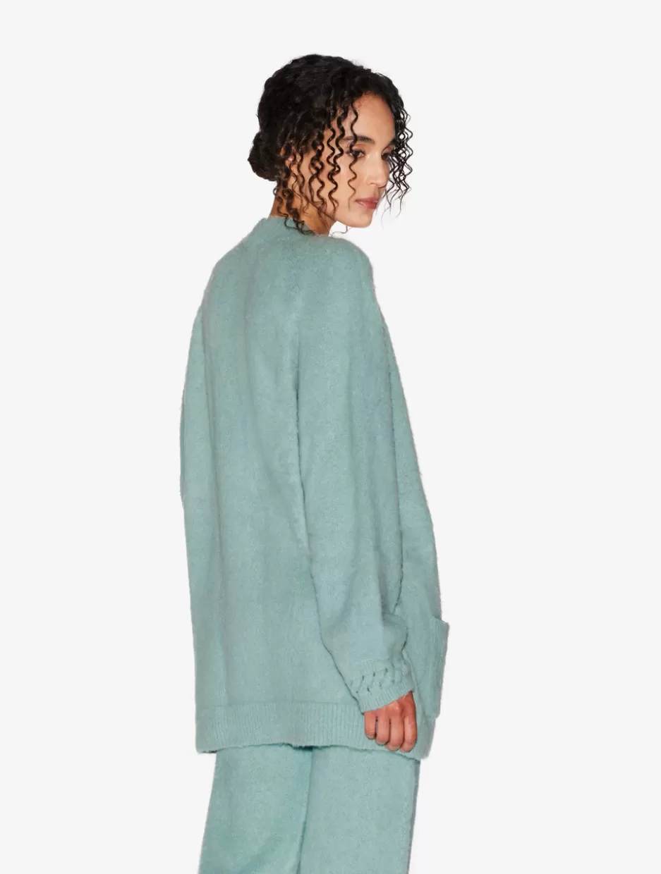 The true embodiment of luxurious comfort, Fluffy Cocoon is a timeless collection of irresistibly soft pieces designed for day-to-day layering and elevated downtime. This beautifully tactile Alpaca blend Cardigan is crafted in a vibrant shade of Almond Green. Cut to a relaxed silhouette, it’s exquisitely finished with braided detailing along the neckline and cuffs. Complete the look with the matching trousers or style with your favourite wardrobe staples.