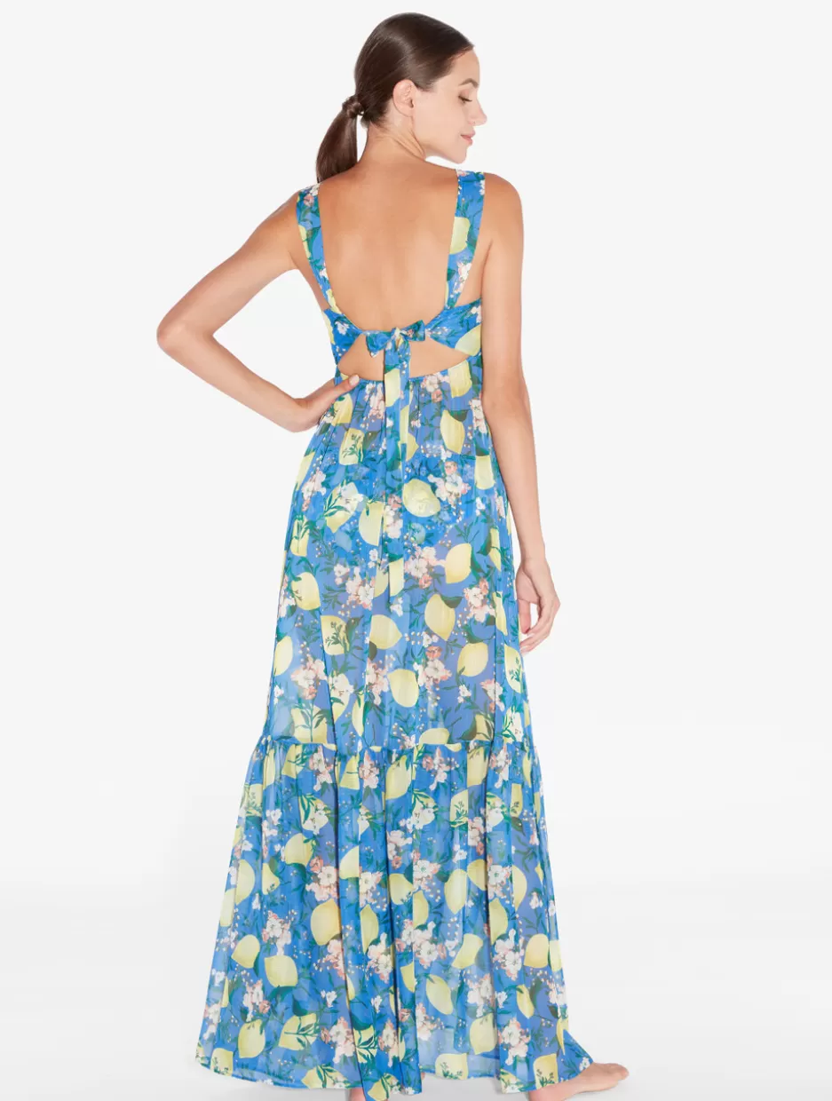 Capturing the irresistible mood of an Italian summer, the Amalfi Twist Maxi Dress in blue features a fresh and vibrant p…