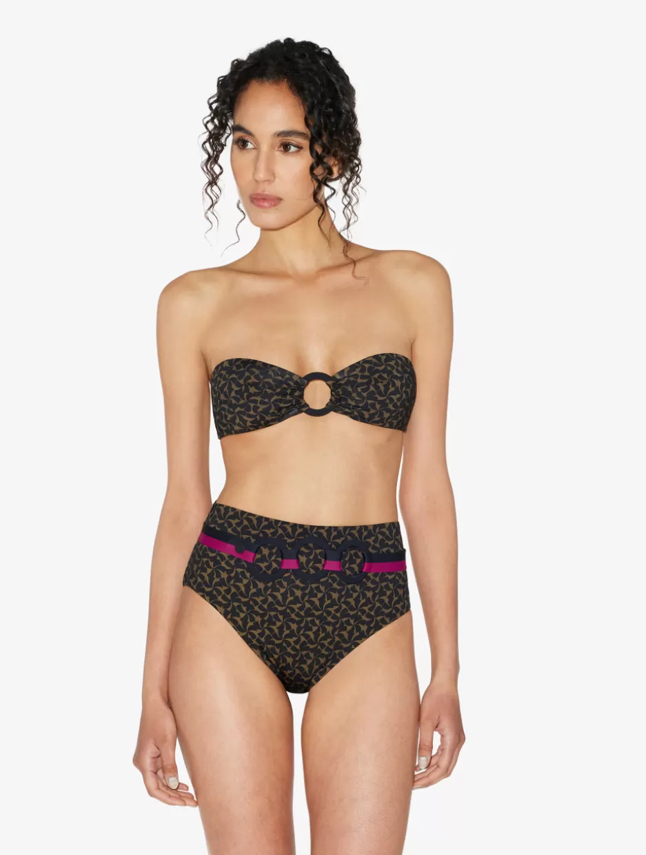 Blending a flawless silhouette with a flattering cut, the Summer Winds bandeau bikini top is conjured in a sophisticated Dark Green and Black print. A contemporary take on a timeless classic, the wireless bandeau style is finished with a striking ring detail and comes with removable padding to offer an exquisite blend of comfort and luxury. Style with the matching low-cut or belted, high-waisted briefs to perfectly capture irresistible summer elegance.