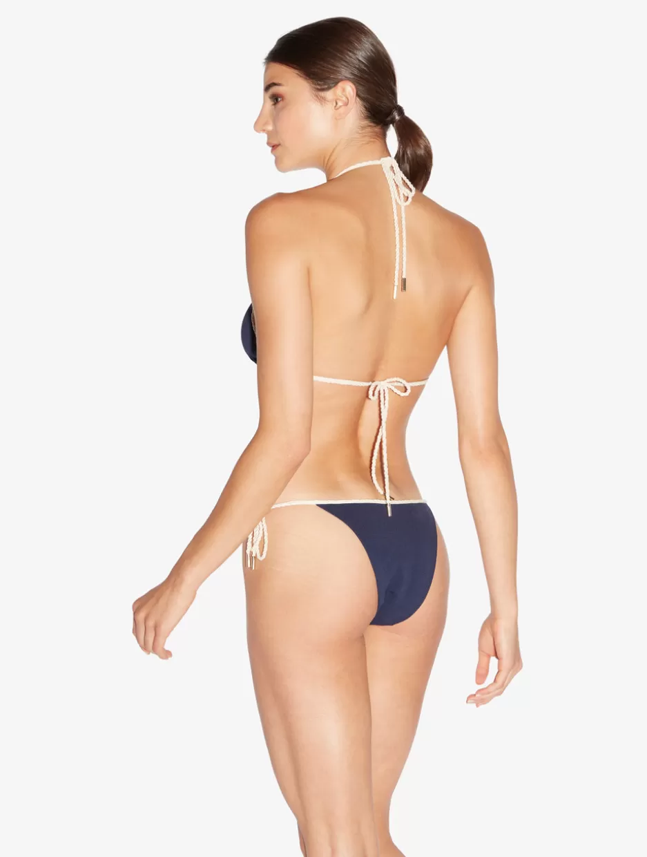 Blending elegant sophistication with a modern nautical spirit, the La Perla Signature Bikini Brief in blue is elevated with the iconic LP monogram in a tonal, stretch jacquard. Cut to a chic, contemporary silhouette with a flawless and flattering shape, it’s finished with contrasting cordonette side ties for timeless resort style. Complete the look with the co-ordinating Bandeau or Triangle Bikini Top.