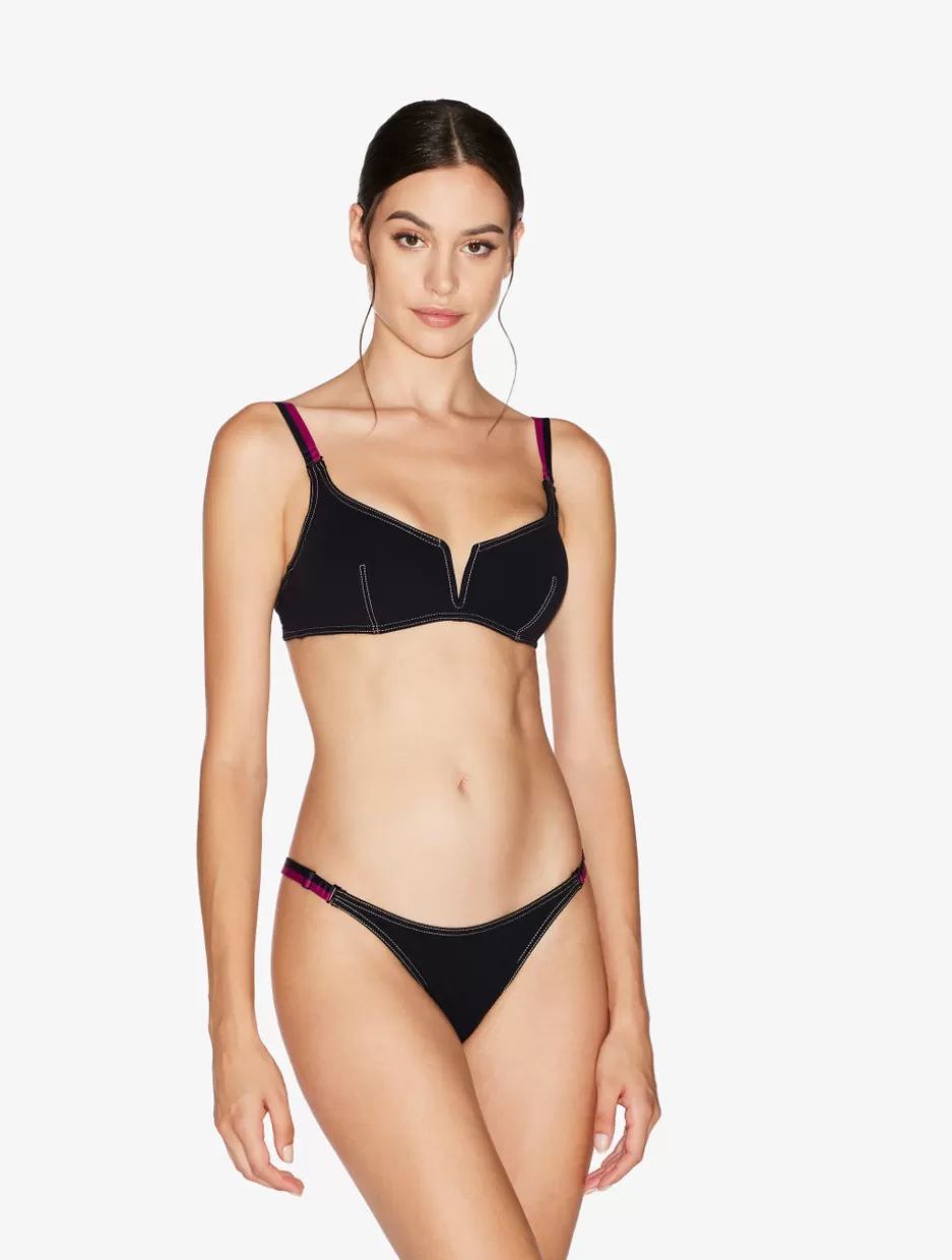 Combining flawless, sophisticated silhouettes with sports-inspired details, the When Summer Comes collection is designed to offer luxurious comfort and make you look and feel incredible whether you’re on the beach or by the pool. Crafted from exquisite stretch Lycra and with a flattering notched shape, the Triangle Bikini Top in Black is wireless with removable padding and finished with contrasting stitching and adjustable, bi-color straps. Style with the matching briefs to complete the look.