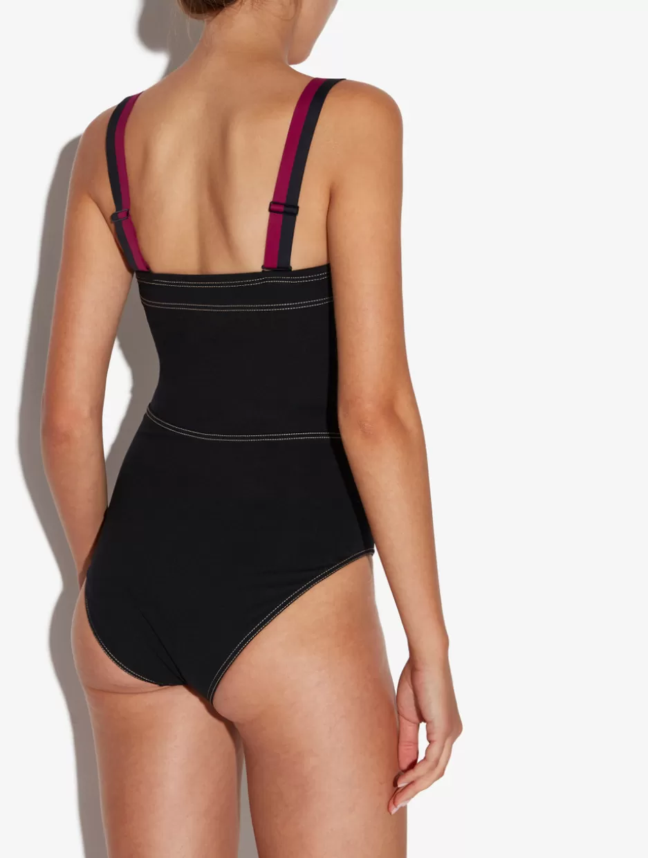 Combining flawless, sophisticated silhouettes with sports-inspired details, the When Summer Comes collection is designed to offer luxurious comfort and make you look and feel incredible whether you’re on the beach or by the pool. Crafted from exquisite stretch Lycra and with an ultra-flattering shape, the Swimsuit in Black is wireless with removable padding and finished with a notched neckline, contoured,contrasting stitching and bi-color adjustable straps.