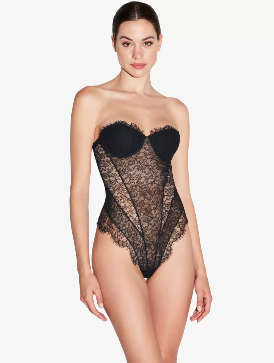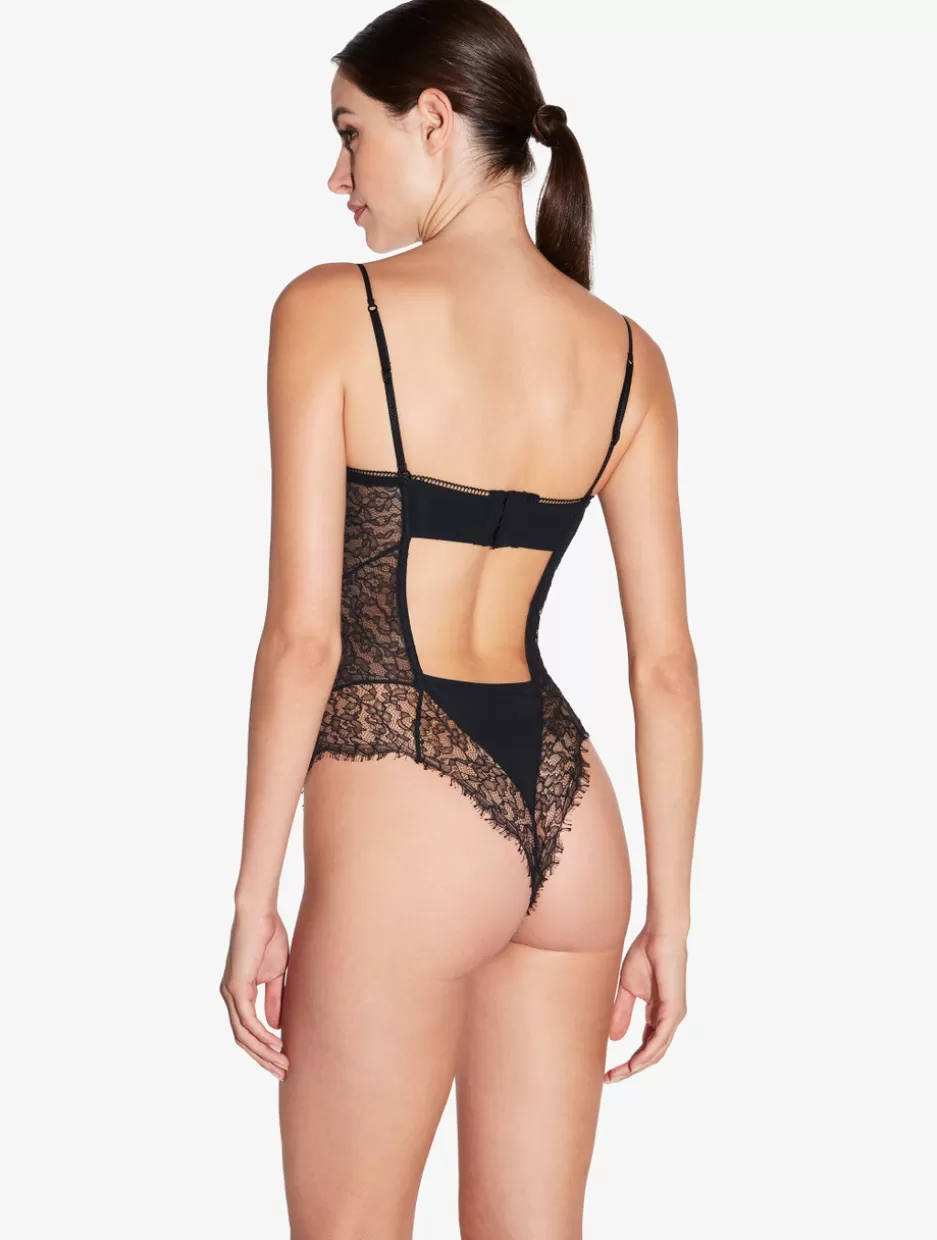 Blending the sensual sophistication of exquisite lace and the luxurious comfort of fluid silhouettes, the Spell On You collection is designed for elevated dressing, everyday. Padded and underwired for a flawless and flattering finish, the exceptional Bodysuit in Onyx has removable straps and is meticulously crafted from lace that creates a beautiful trail of winding florals across the skin. Use as the ultimate underpinning to your most empowering looks or style underneath an oversized blazer to give unexpected glimpses of what lies beneath.