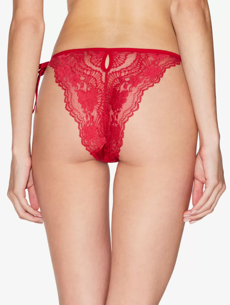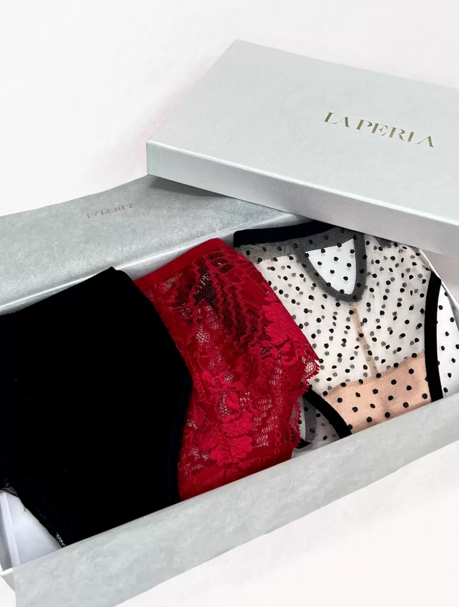 A trio of our most-loved side-tie briefs. All cut to a universally flattering Brazilian silhouette, the set includes a pair in sheer polka-dots with keyhole detailing at the back; a bold red pair in exquisite lace; and a timeless black pair with lace detailing at the back.Elevated underpinnings to your favorite ready-to-wear looks.