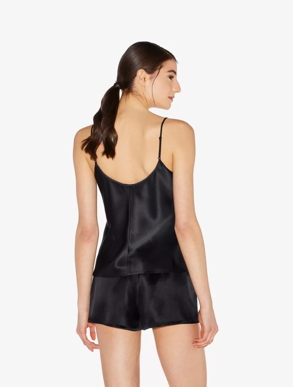 An elegant silk camisole with thin, adjustable shoulder straps and a cool, comfortable feel. Its body-skimming shape and lustrous finish have a simple, sophisticated effect. A scooped neckline flashes the décolleté for a sensual finish. Complete the set with matching silk shorts.