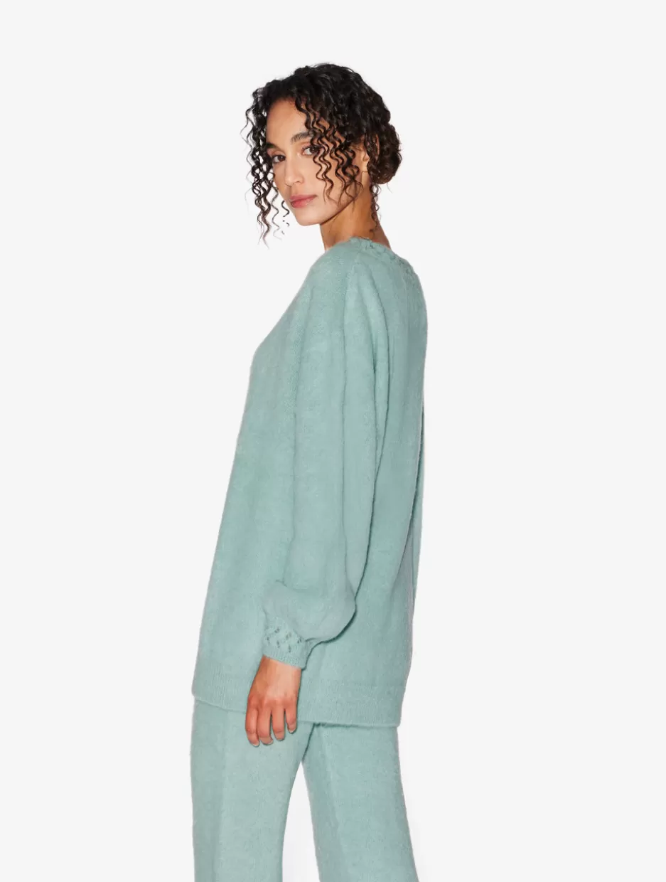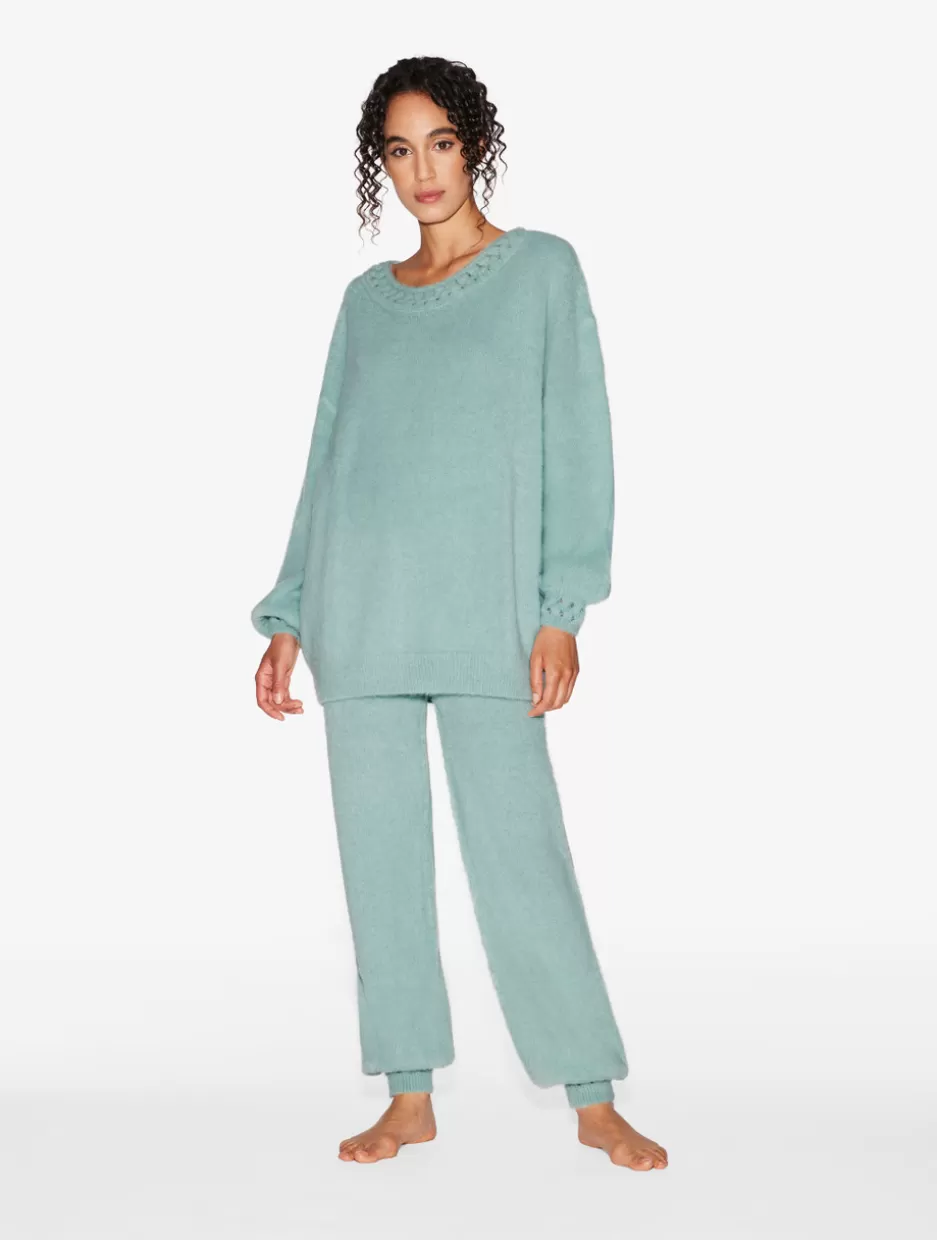The true embodiment of luxurious comfort, Fluffy Cocoon is a timeless collection of irresistibly soft pieces designed for day-to-day layering and elevated downtime. This beautifully tactile Alpaca blend Sweater is crafted in a vibrant shade of Almond Green. Cut to a relaxed silhouette, it’s exquisitely finished with braided detailing along the neckline and cuffs. Complete the look with the matching trousers or style with your favourite wardrobe staples.