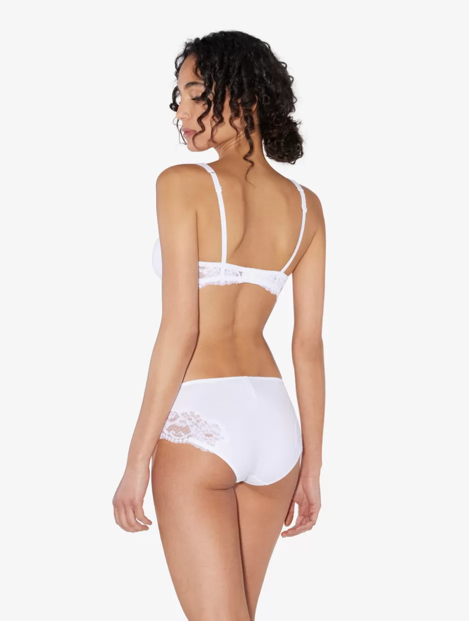 Mid-rise briefs in stretch cotton jersey that is delicate and thick to the touch. The result is a versatile, comfortable and elegant piece of underwear. The piece is embellished with floral stretch Leavers lace inserts.