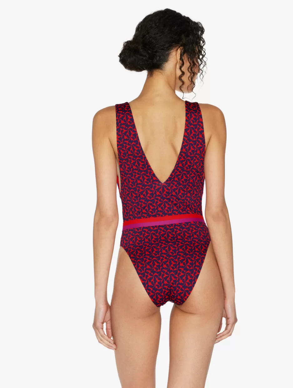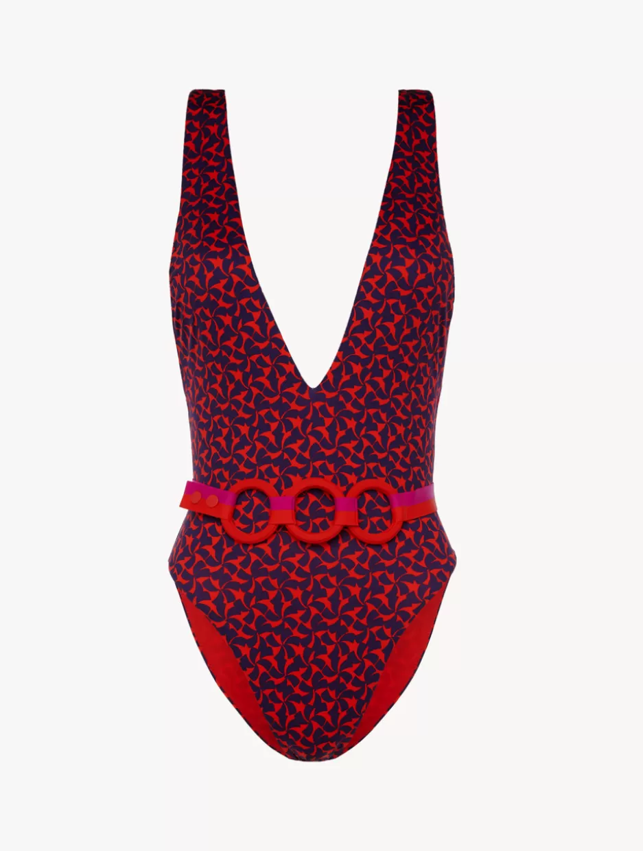 A classic silhouette given a boldly sophisticated spin, the Summer Winds swimsuit, printed in striking Red and Blue, is a show-stopping one-piece that’s designed to be treasured. Flawless and flattering, it’s deeply cut at the front and back and comes with removable padding and a detachable, ring-detail belt for versatile styling options.