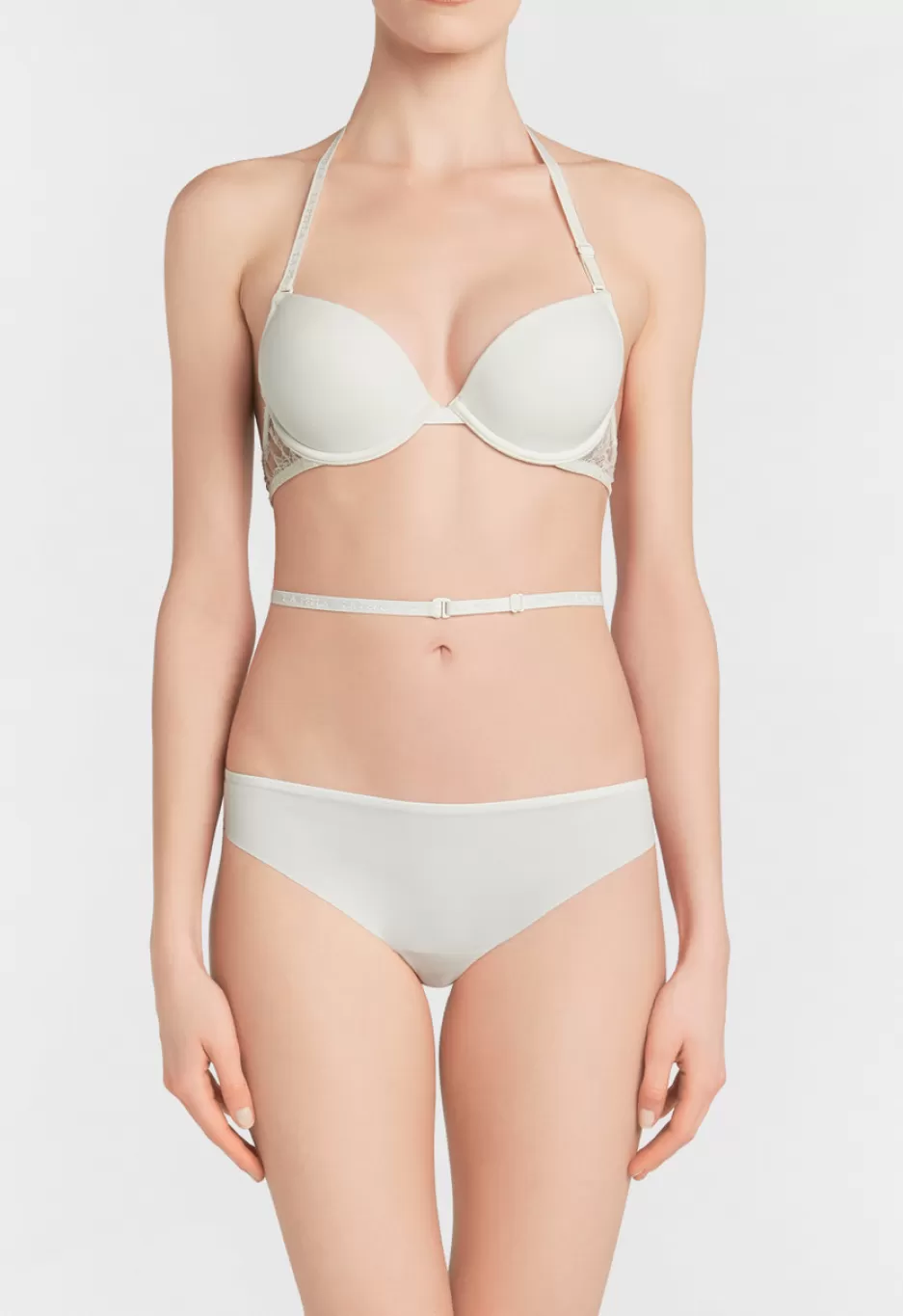 A perfect range of underwear to enhance the figure under any garment, with an added touch of romance. American bra made from LYCRA® Beauty, a high-quality, incredibly comfortable fabric with a compact texture, characterised by an elegant width of stretch Chantilly lace. This multifunctional bra is extremely versatile, letting you play with different necklines and transparencies. Reinvent your look with underwear that can be personalised for any occasion, thanks to moveable straps that can be worn six different ways. Performed cups and internal pockets for additional padding.