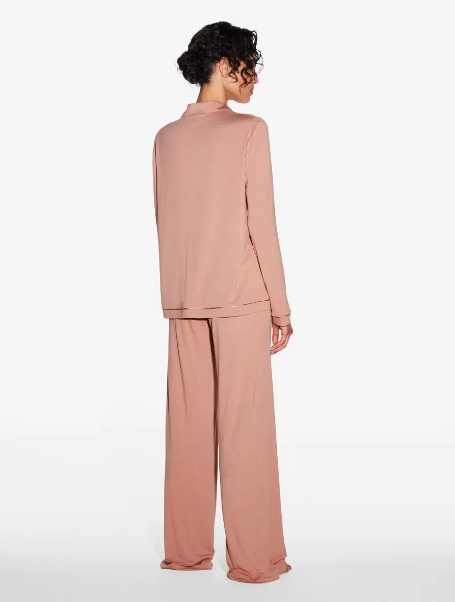 A powerful blend of contemporary femininity and everyday luxury, the Midnight Botanica collection combines romantic detailing and tactile fabrics in timeless pieces that are designed to be treasured. The embodiment of elevated comfort, the button-through Pajama top and co-ordinating trousers in Blush Clay are crafted from a soft stretch jersey made from sustainably-sourced viscose and beautifully finished with silk satin piping.
