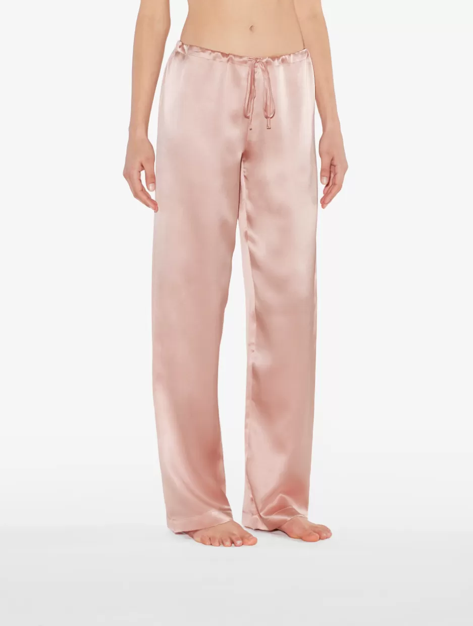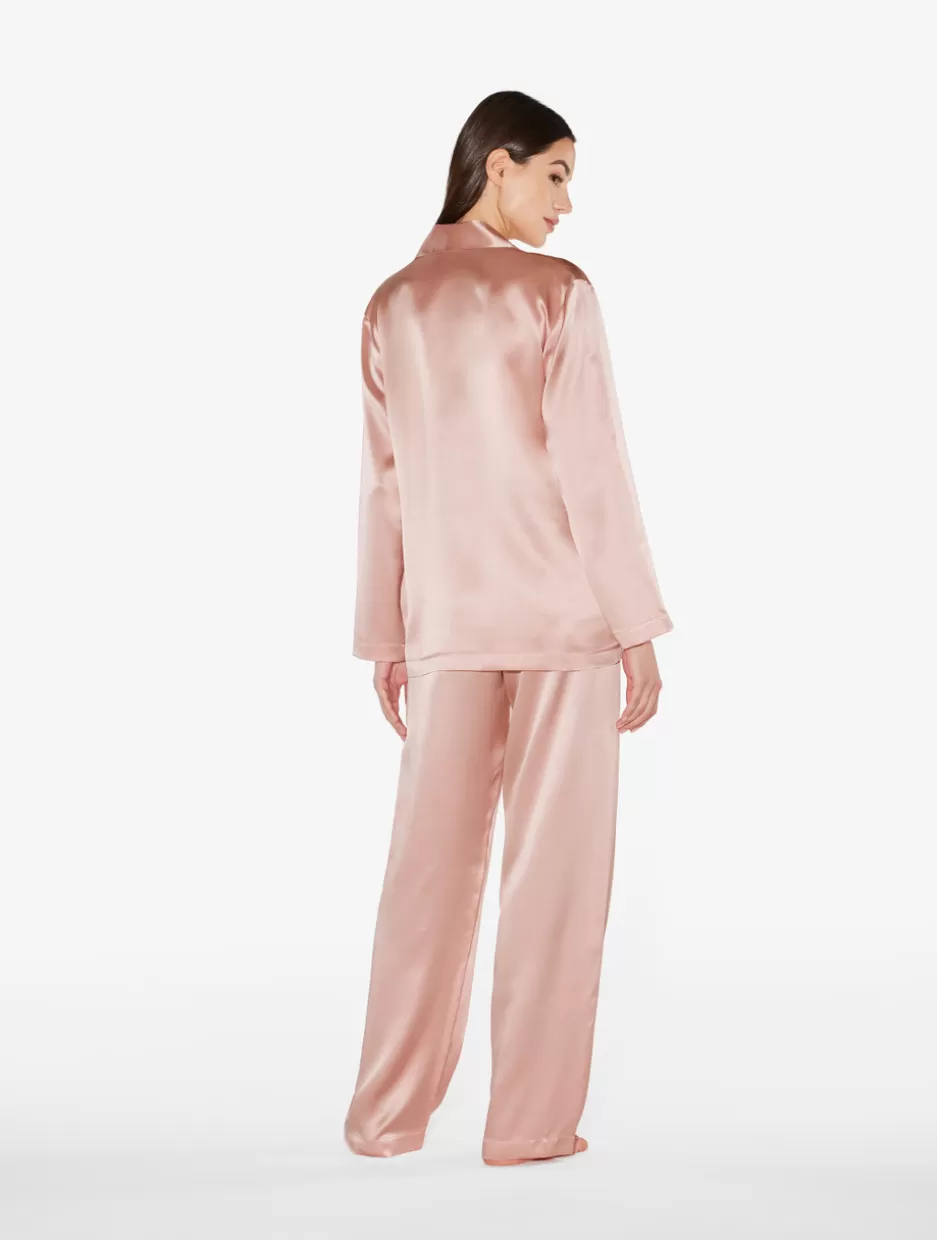 Classic pajamas in luxurious pure silk satin. Lightweight and lustrous with a buttoned and collared shirt, drawstring trousers and a pale shade of powder pink, this sophisticated set is a nightwear essential with a feminine effect. A long, relaxed cut and a soft feel against the skin make them superbly comfortable and perfect for wear throughout the seasons. Pair with the matching long silk robe.