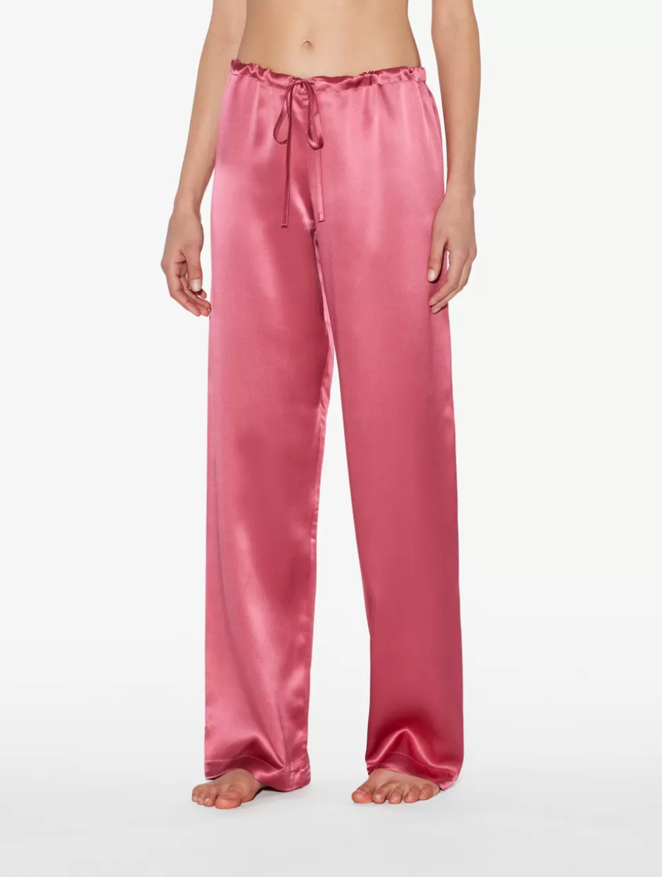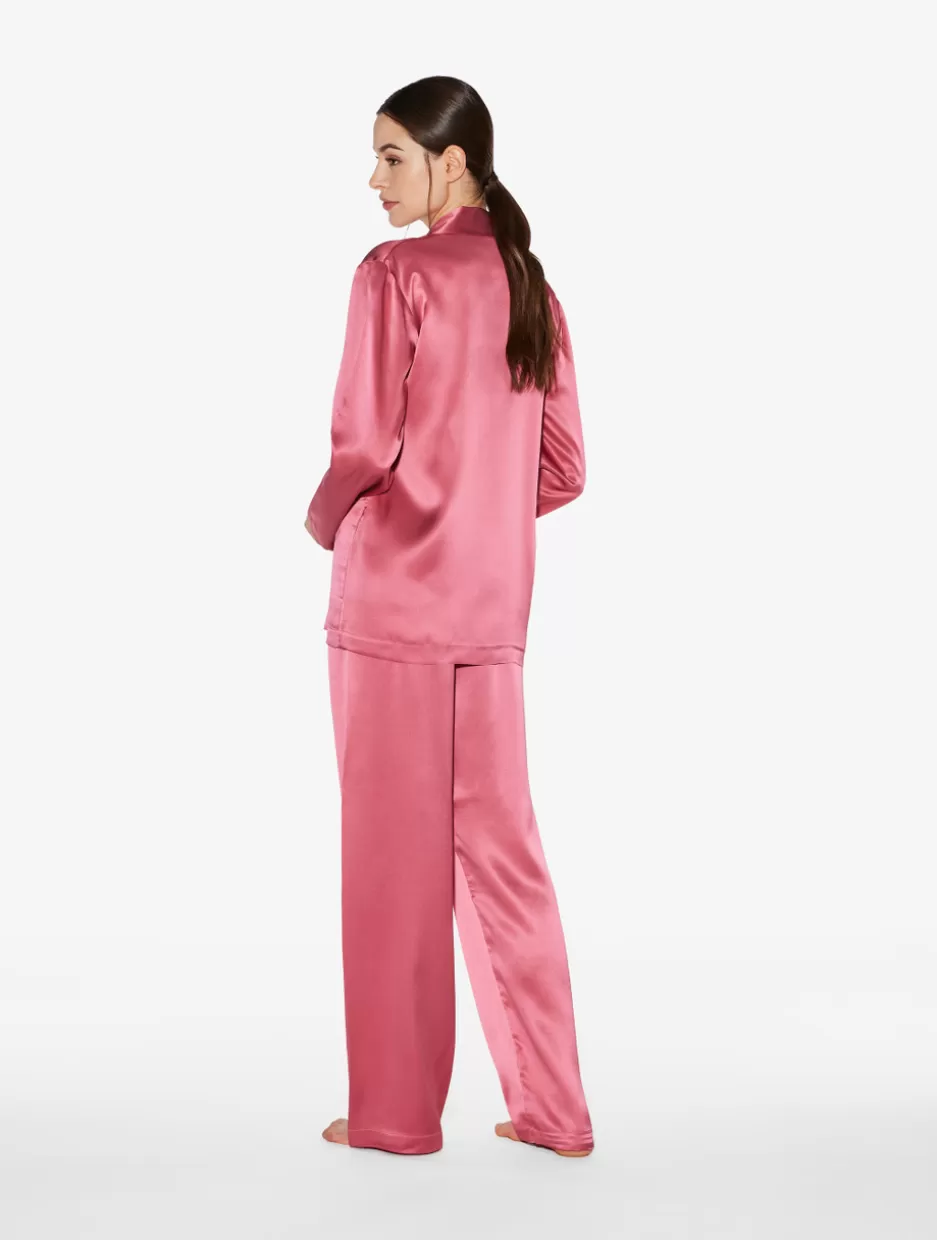 Crafted from pure silk satin, this essential nightwear collection is endlessly appealing. These supremely soft pieces are a pleasure to sleep in, while doubling as luxurious separates during the day. This pajama set includes a classic button-down shirt with long sleeves and matching trousers with a drawstring waist and a relaxed fit that makes them ideal for lounging.