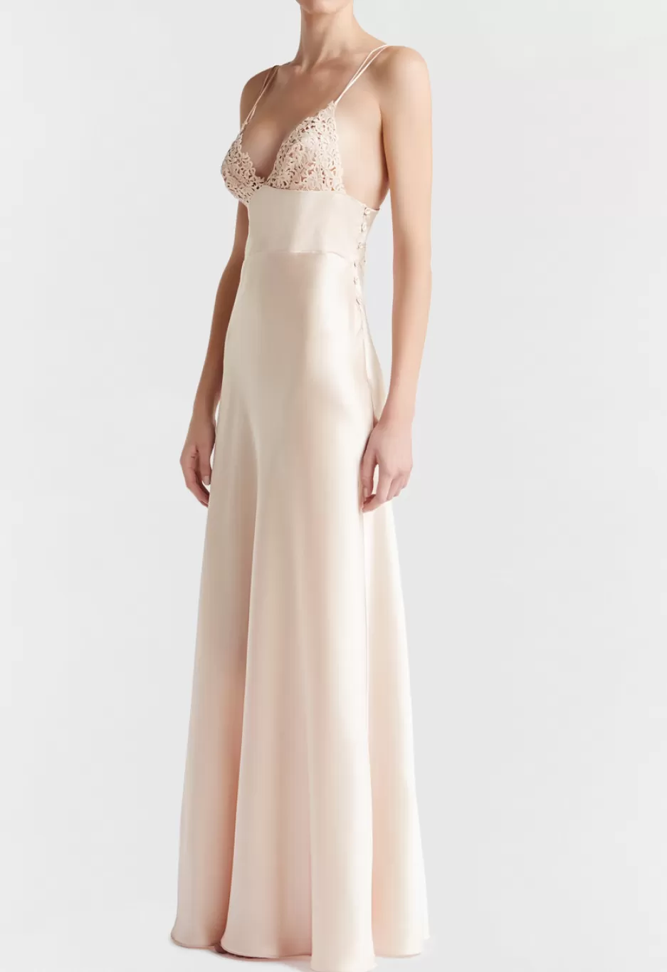 Long night dress in pure silk satin embellished with refined macramé frastaglio appliqué. Details in stretch silk organza. Made in Italy.