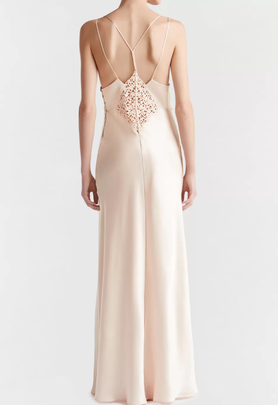 Long night dress in pure silk satin embellished with refined macramé frastaglio appliqué. Details in stretch silk orga…