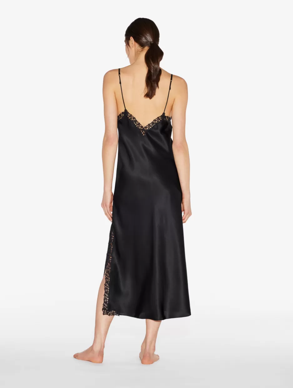 Lovingly crafted from exquisite black silk and hand finished using the art of frastaglio appliqué to create a delicate swirling effect across the skin, our long Petit Macramé nightgown is the embodiment of elegant sophistication. Style with our coordinating robe or add heels for elevated after-dark dressing.