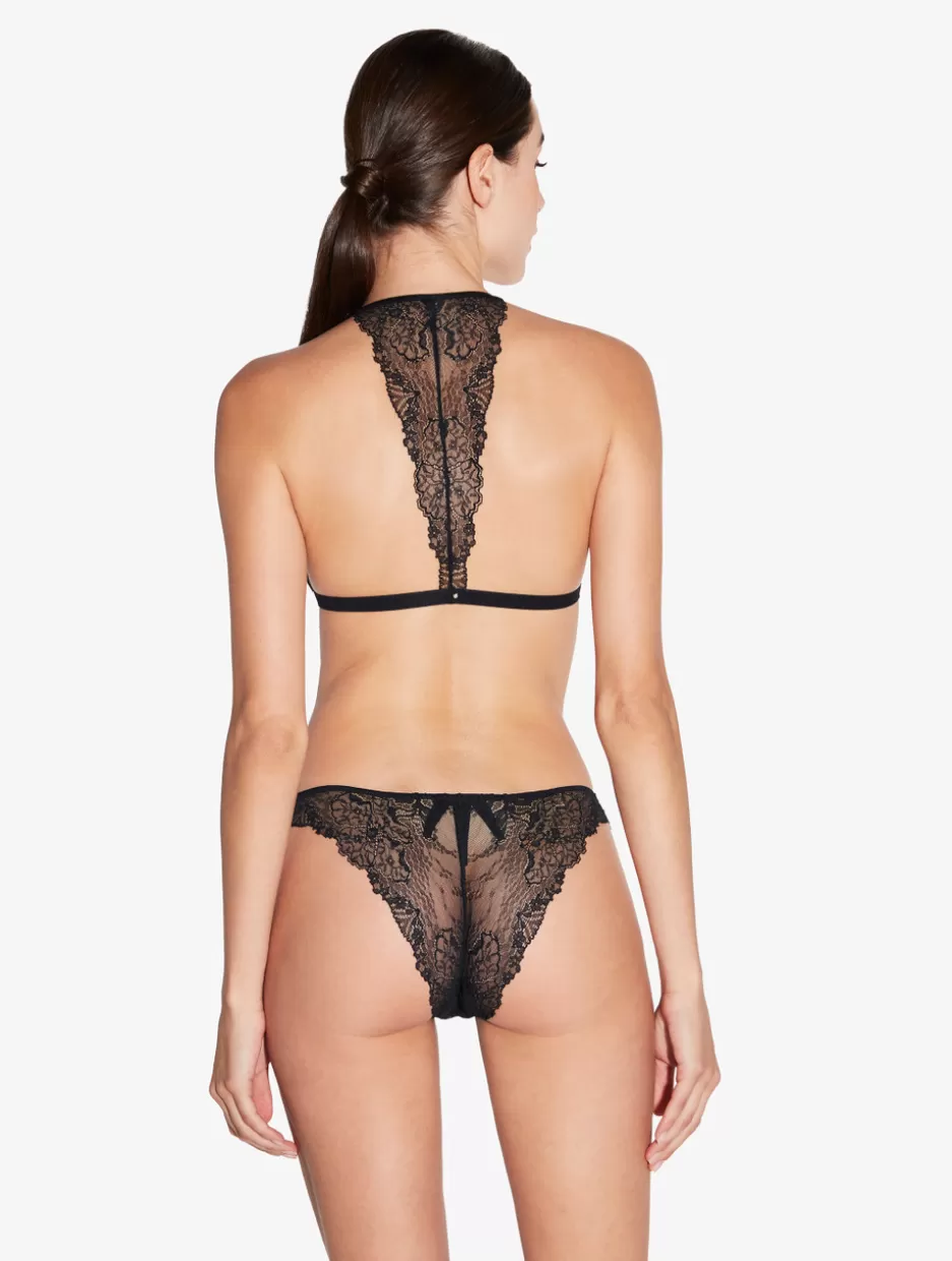 Each powerful piece in the Diamante collection is an expression of modern femininity, made to elevate your most special and intimate moments. The Soft Triangle Bra in Black is as seductive as it is sophisticated.Inspired by an iconic piece from the La Perla archive and crafted from exquisite Leavers lace upcycled from our Bologna Atelier, it’s lovingly finished with a delicate crystal detail at the back. Its striking back detailing is designed to be seen and styled under tops and dresses that reveal its beauty. Complete the look with the matching Brazilian Briefs and Suspender Belt.